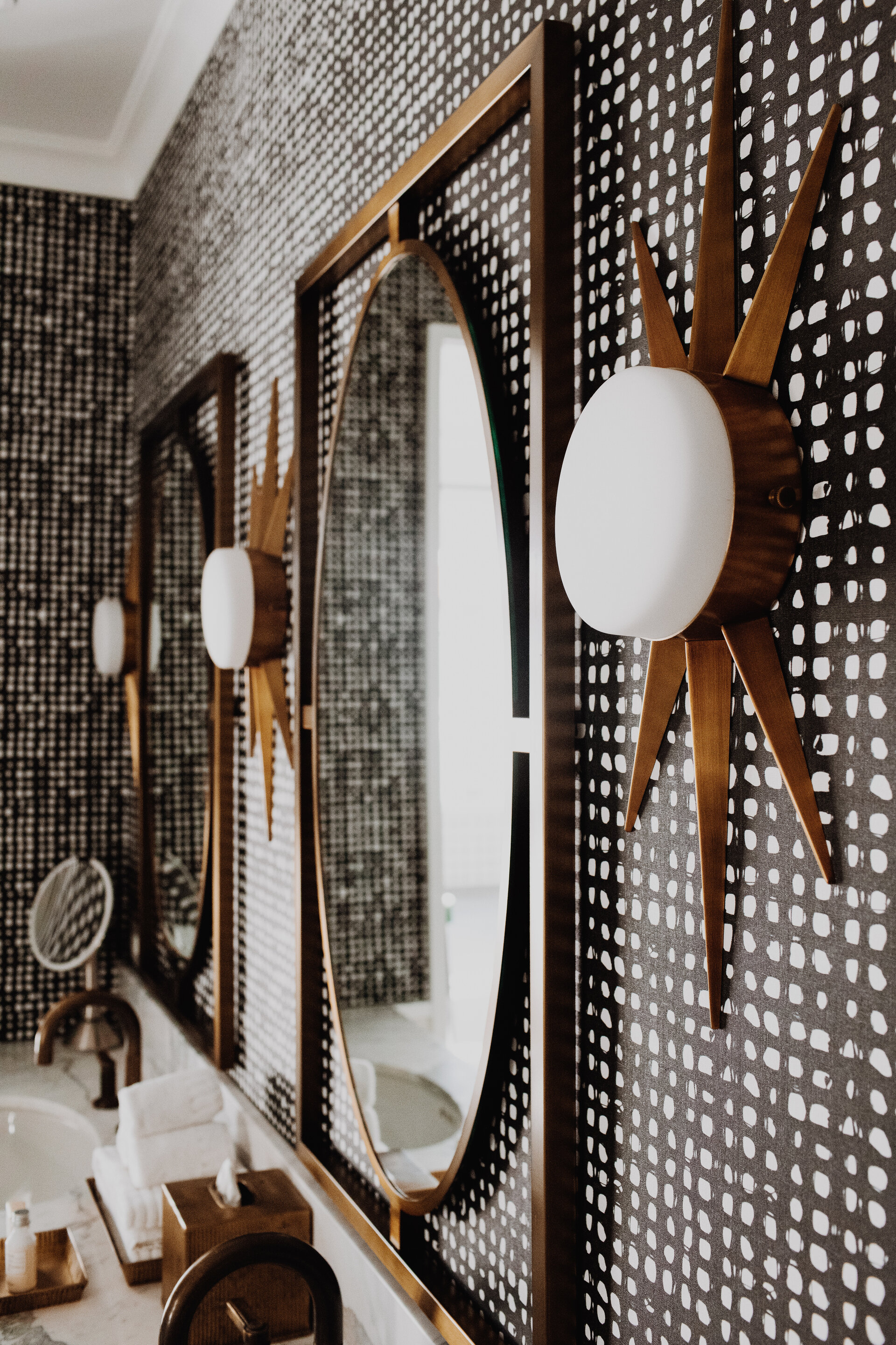 Item34, Link to Larger Image, Round light with spiked decoration, next to the corner of a mirror on a black and white wall at our Santa Barbara luxury hotel Round light with spiked decoration, next to the corner of a mirror on a black and white wall at our Santa Barbara luxury hotel