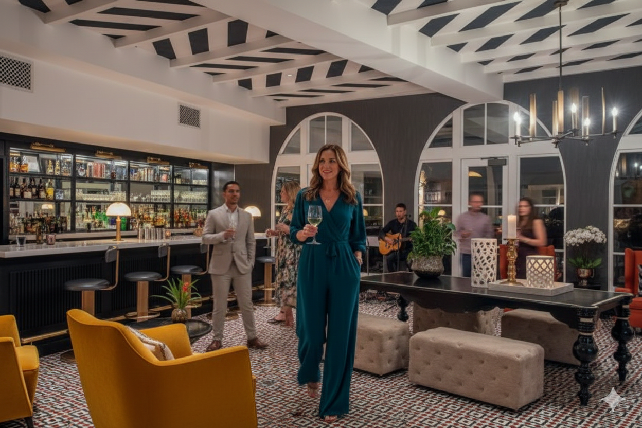 Woman in a casual blue jumpsuit holding a glass of white wine while walking through a lounge and bar in Santa Barbara. Link to Larger Item Photo